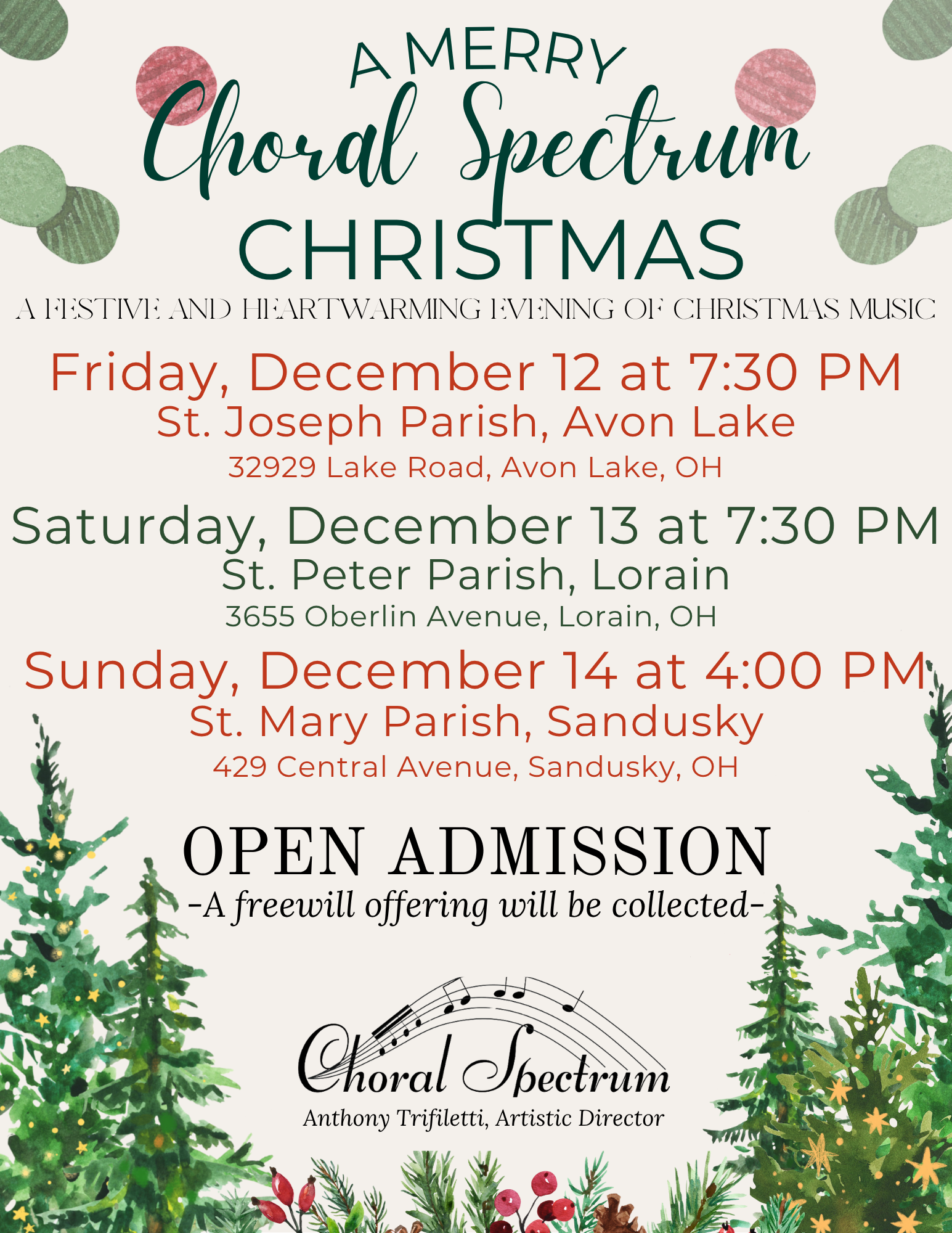 Organized by Choral Spectrum, the Choral Masterworks Concert is an effort on the part of Lorain area choirs to combine, and enjoy performing together, an extended work of the standard repertoire of choral masterpieces with the appropriate accompaniment specified by the composer. Participating choirs may choose to perform individually works that are masterworks as well. These past concerts have been directed by guest conductors from the Oberlin Conservatory of Music.